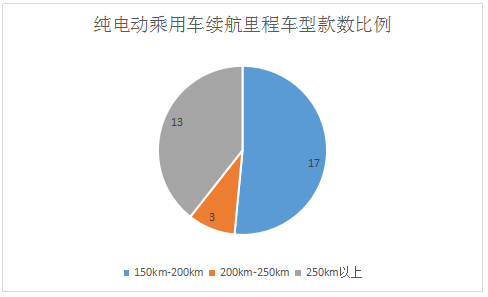 在33款纯电动乘用车车型中,能量密度在90Wh/kg-120Wh/kg的车型共有15款,在120Wh/kg以上的车型共有18款。纯电动乘用车续航里程均在150km以上,其中续航里程在150km-250km之间的车型有20款,在250km以上的车型有13款。从电池能量密度和续航里程来看,第三批推荐目录中能够拿到1.1倍补贴的纯电动乘用车占比超过50%,续航里程在200km以下的车型有14款,在250km以上的车型有13款,整体趋势向高低两端靠拢。在插电式混合动力乘用车方面,续航里程主要分布在60km-80km之间。在38款新能源乘用车车型中,有34款车搭载的动力电池为三元锂电池,占比近90%。