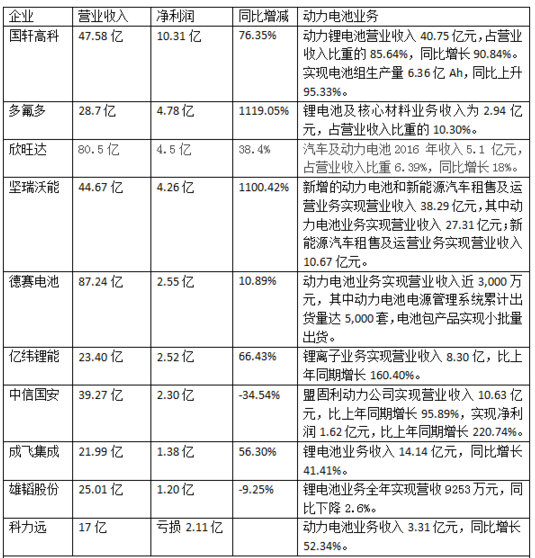 近日,国轩高科、多氟多、欣旺达、德赛电池、亿纬锂能、中信国安、成飞集成、雄韬股份、科力远等10家涉足动力电池业务的上市公司2016年报陆续发布。