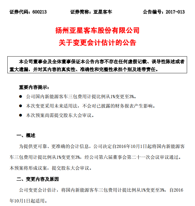 亚星客车提高新能源客车三包费用计提比例,预计2016年减少利润2232万元