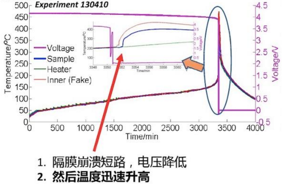 试验数据显示,当电池单体温度达到135℃时,隔膜开始融化,电压下降;150℃电池电压快速下降;等温度高达245℃时,隔膜完全崩溃,电池就会出现起火爆炸的现象。
