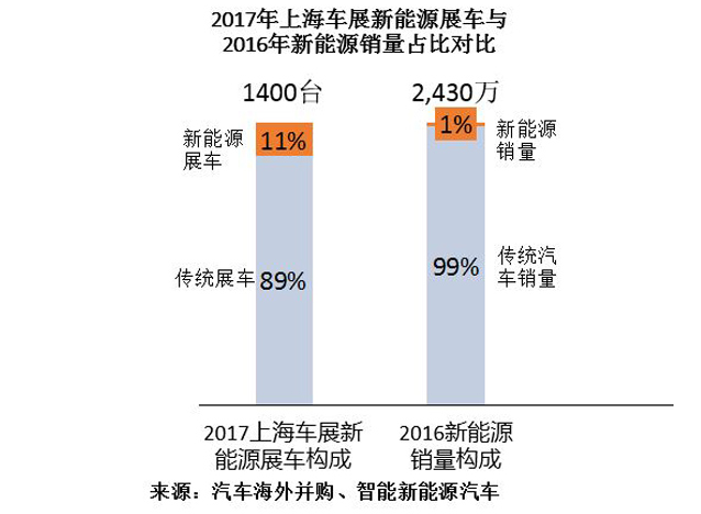 本届车展新能源展车共有160台,占所有1400台展车数量的11%。而在2016年中国乘用车销量的2430万中,新能源乘用车销量31.6万台,占乘用车总销量的1.3%。 11%的新能源展车占比与1.3%的新能源实际销量占比相对照,说明了新能源汽车业界对未来充满信心,并为此做了充分的产品规划准备。