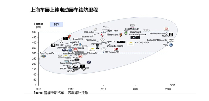 据不完全统计,本届车展有超过70%以上的展车特别是概念车的续航里程都在300-500公里之间,其中造车新势力几乎就成了高续航里程代名词,体现了未来企业集中精力提升里程以更好地满足政策(补贴政策+新能源积分政策)和市场需求(消费者通常以汽油车一箱油可行使500公里左右里程为电动车的默认标准)的趋势,这与2016年中国市场上纯电动汽车产品70%以上续航里程集中在150-250公里之间有了至少100%的增长。