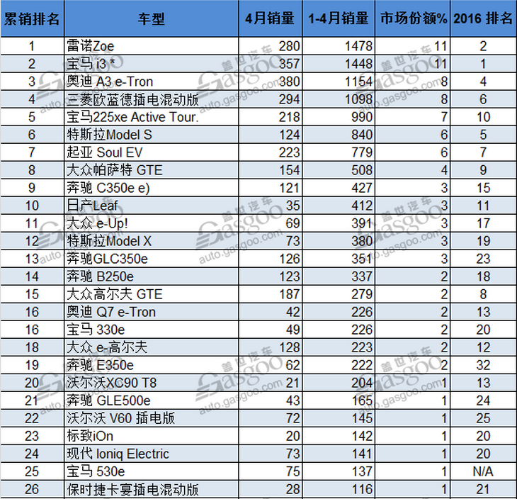奥迪A3 e-Tron与欧蓝德插电混动版的排名进行了对换,奥迪A3 e-Tron则凭借1,154的累计销量排在第三位。大众帕萨特GTE的累计销量排名上升一位至第八位,而姊妹品牌高尔夫的销量因插电混合版高尔夫GTE的推出,累计销量排名上升至第15位,上个月共计售出187辆,创下近21个月以来最好成绩;纯电动版高尔夫的累计销量排名上升至第18位,四月份共计售出128辆,为近八个月以来最好成绩。作为电动汽车市场的老兵沃尔沃V60插电混动版前4个月的累计销量排名攀升5位,排在第22位,4月份共计售出72辆。奔驰旗下的三款车型都有着非常好的表现,包括B250e, GLC350e and S500e。