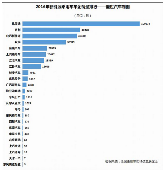 全国乘用车市场信息联席会(乘联会,CPCA)统计数据显示,从2016年全年累计销量来看,国产新能源乘用车整体销量为32.4万辆,同比增长84%。其中,比亚迪是最大赢家,旗下三款车型占据了近20%的市场份额,整体销量超过十万辆。