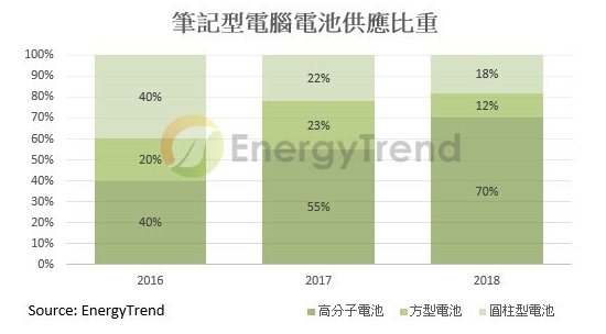 EnergyTrend资深研究经理吕理舜指出,观察整体IT电池的供应状况,预估2017年圆柱型电池占整体供应比重将持续降低至22%,而高分子电池需求则持续上扬,预计供应比重将从2016年的40%跳升至2017年的55%。