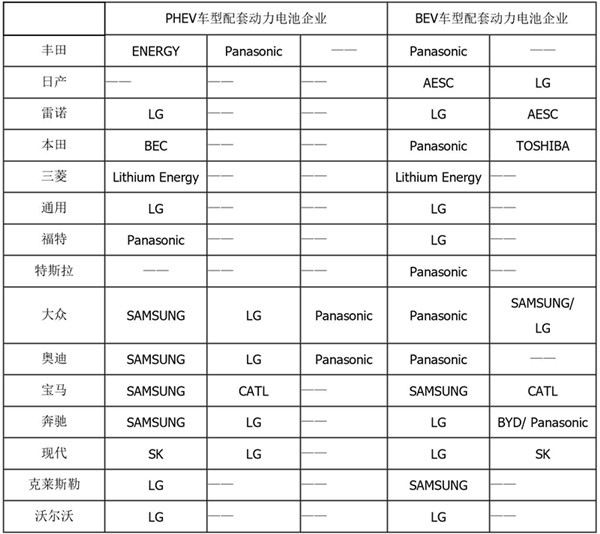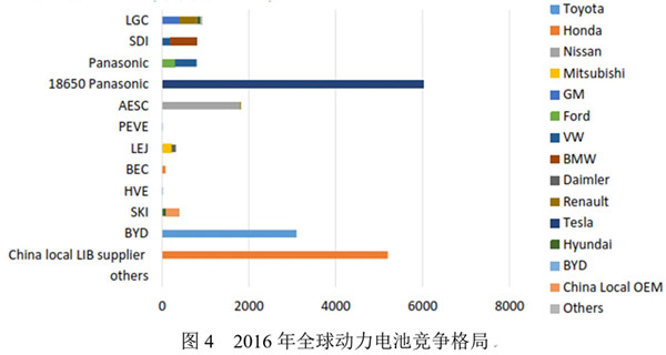 目前全球动力电池配套的配套供应商主要集中于日、韩、中三国,2016年锂动力电池竞争格局为:日系、韩系新能源汽车配套日韩主机厂控股或合资合作的动力电池企业产品;美系新能源汽车配套日韩动力电池企业产品,其中特斯拉正在筹建自己的超级动力电池工厂;欧系新能源汽车配套日、韩、中三国领先的动力电池企业产品。这些整车厂的纯电动与插电式混动汽车都至少选择了2~3家动力电池供应商。