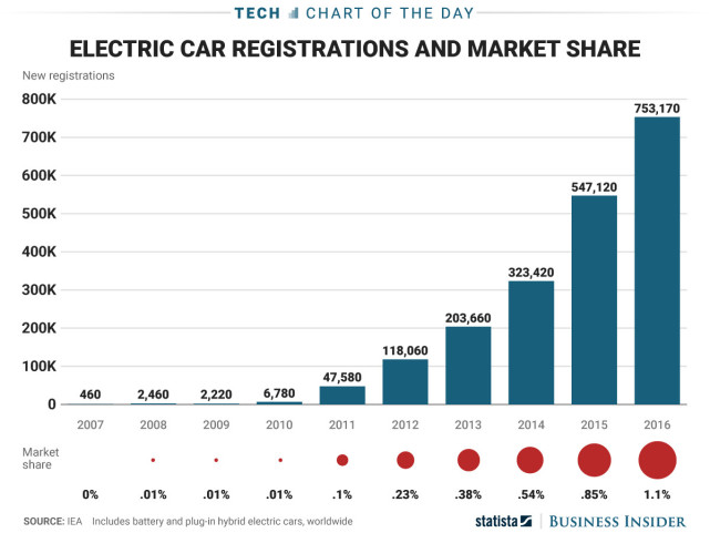 电动汽车总量增加固然是好事,但是这仍然是一个小众市场。从公布的图表来看,电动汽车注册量仅占整个汽车市场注册量的1%。国际能源署表示,去年在全球道路上行驶的200万辆电动汽车仅占上路的轻型汽车总量的0.2%。
