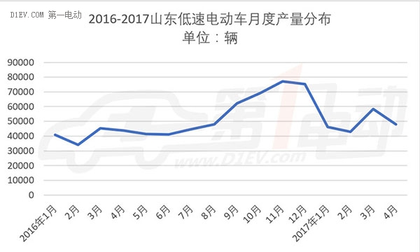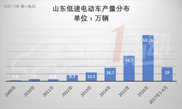 山东作为全国最大的低速电动车市场,产销量走势具有风向标意义。据第一电动网研究院数据统计,山东市场过去五年一直保持高速增长,2012年至2016年同比增幅分别为196.4%、45.8%、54.4%、85.6%、79.4%。在第七届全球新能源汽车大会上,山东省汽车行业协会常务副会长兼秘书长魏学勤表示,2016年产销突破60万辆,产销量分别达62.26万辆和61.83万辆。