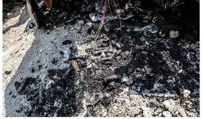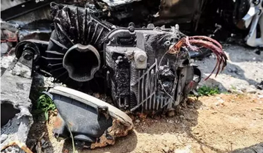 铝合金锻造的轮毂也被撞碎,同时又烧灼的痕迹。