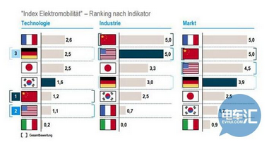电动车指数比较了德国、法国、意大利、美国、日本、中国与韩国的电动车竞争力,重点关注三大关键指标:技术、产业发展与市场。中国在产业发展指标上取得第一,市场指标上取得第二位,技术指标上第五位,综合成绩第一。这是中国首次在电动车指数排行榜上名列第一。