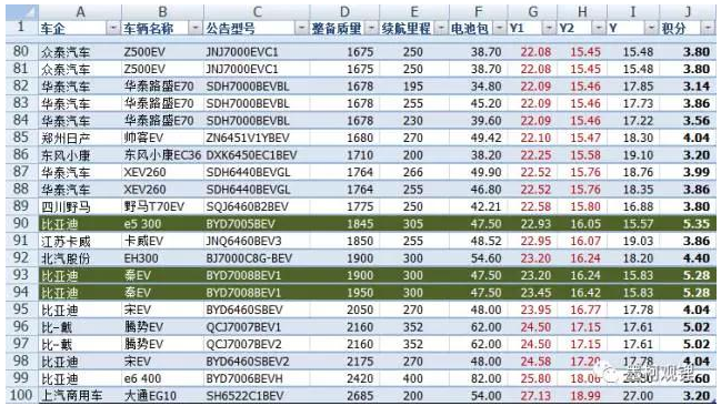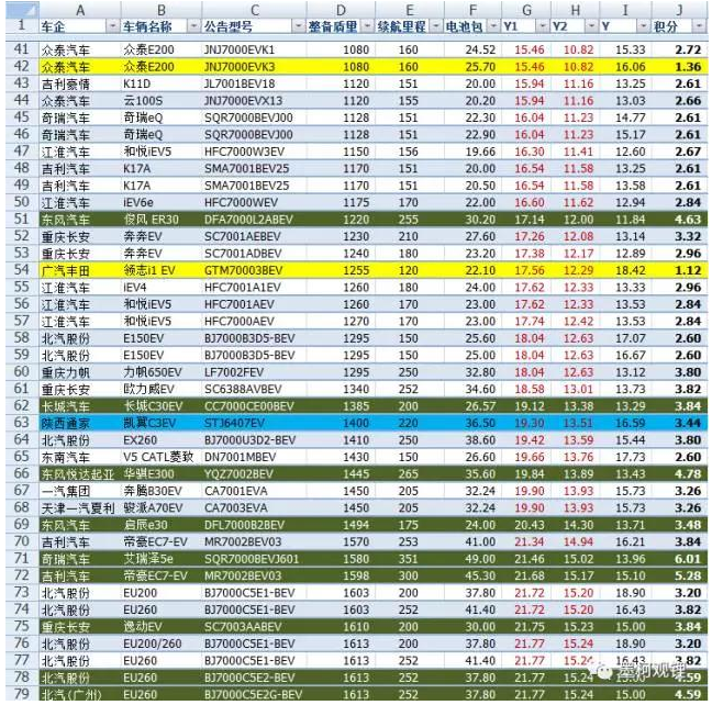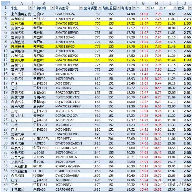 从表中整理的情况看,积分系数为1的产品共有82款,占比接近83%。积分系数为0.5的有5款产品,占比约5%,分别是:广汽丰田领志i1EV(GTM70003BEV)、吉利知豆D2(JL7001BEV35和SMA7001BEV61)、吉利知豆D1(SMA7001BEV22)、众泰E200(JNJ7000EVK3),都是微型车。表中以黄颜色显示。