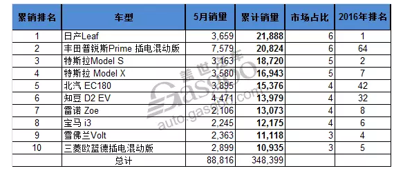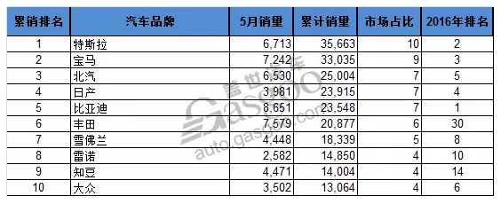十名开外的车型当中,表现较好的是来自中国的品牌比亚迪e5,上月共计售出了3,131辆,在5月单月的销量排名当中排在第7位;吉利帝豪电动版上月售出3,015辆,在5月单月的销量排名当中排在第8位,创年初至今最好成绩;江淮iEV6S上月的销量也刷新了历史,共计售出2,572辆,在5月单月的销量排名当中排在第10位。