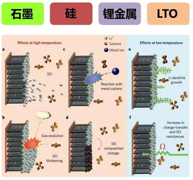 负极材料的工作往往依赖于有效的异质结构钝化层,温度升高将使得钝化结构破坏,并引发副反应;而温度降低又将降低锂离子的透过性。