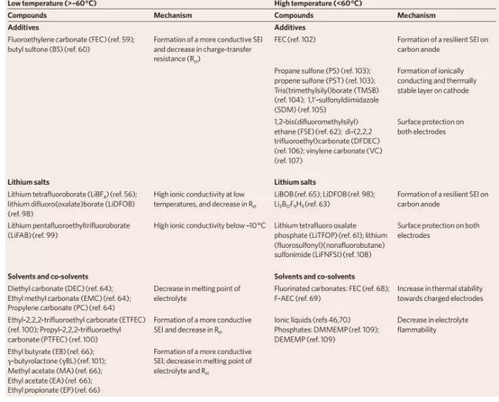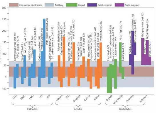 低温条件下,电解质粘度增加,阻碍离子迁移和电极润湿性,降低比率性能;而且,导电性降低将引起电极周围锂离子的消耗。高温条件下,电解质容易发生化学变化,并和带电的电极发生反应。