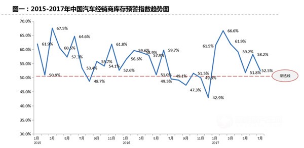 从中国汽车流通协会刚刚发布的7月份经销商库存预警指数来看,经销商销售压力较大,今年下半年的开局并没有明显好转。数据显示,2017年7月库存预警指数为52.5%,比上月下降5.7个百分点,位于警戒线以上。