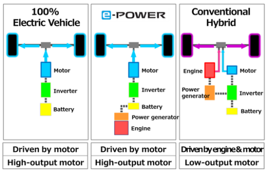 在普通混动系统中,通常会采用低输出电机并搭配汽油机,在电池电量较低(或高速行驶)时可为车轮提供驱动力。然而,在e-POWER系统内,汽油发动机与车轮无关联,仅被用于为电池充电。不同于纯电动车,e-POWER动力源来自于发动机及电池。该系统结构通常需要采用较大的电机及电池,因为电机仅仅是用于驱动车轮的直接动力源,使得汽车行业难以在紧凑型轿车上安装该系统。