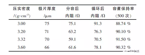 同样,不同压实密度的电池循环前后的内阻也有较大的变化,如表2所示。