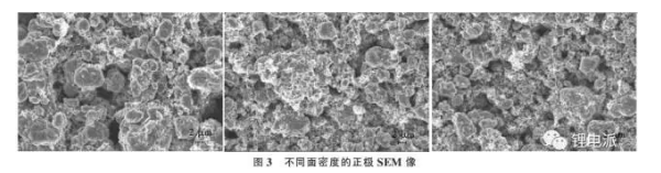 不同面密度极片在SEM下如图3所示。可见,极片面密度越低,材料的孔隙率增大,单位质量的材料电解液的吸附量因而增大,相应的减小溶液接触电阻;另一方面较小的面密度,极片厚度较小,减小锂离子的扩散距离,同时面密度越小,正负极材料的浓度差越小,降低扩散的阻力,提高锂离子在材料中的扩散速度;且极片越薄,在充放电中锂离子不断的嵌入与脱出对极片结构造成的变化也越小;同时,面密度较小,化成时形成的SEI 薄而稳定,减少锂离子在SEI 膜中的迁移阻力。而面密度较大时,界面电阻增大,从而降低锂离子在材料中扩散速度,当大电流充电时,锂离子不容易从材料中脱出,易造成极化,可逆锂离子减少,因而容量衰减。由此可见,想要使电池具有优异的倍率性能,则需要降低极片的面密度。但是,这必将以电池的容量为代价,快充快放与电池容量不可兼得,需要在两者间把握一个合适的值。