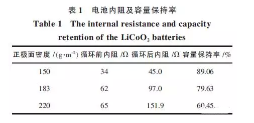电池在循环过程中,锂离子不断的脱嵌、嵌入,进行摇椅式运动。随着循环次数的增加,必然会有锂离子脱嵌失败、锂金属析出、电解液氧化分解、产气等副反应发生。通常,电池的内阻会随着电池使用时间的延长而逐渐增大,即内阻变化越小,电池循环寿命越长。表1是不同面密度电池循环一定次数后内阻的变化情况,这也反应了不同面密度对电池内阻的影响。由表1可知面密度为150 g/m2时,电池初始电阻最小,大电流充电后电池内阻增加较小;随着面密度增加,电池内阻增大,在充放电循环中电池内阻增加也较大。
