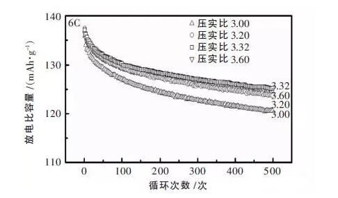 由图4中可以看出,6 C大电流充电时, 随压实密度增大其首次放电比容量差异不大,但随着循环次数的增加,放电比容量和电池容量维持率均出现了先升高后降低的情况,电池在压实密度为3.32g/cc时,达到了循环性能最优。