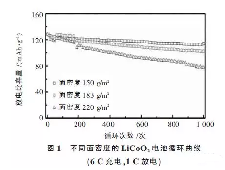“充电五分钟,通话一小时”是我们常常听到的广告,广告涉及到的内容其实是电池的快充功能。电池快充功能与电池极片的面密度和压实密度密切相关,为了验证不同面密度对电池快充的影响,利用钴酸锂为正极、石墨为负极制作了软包电池。图1是不同面密度极片的电池在快充(6C)条件下的循环表现。由图1可以看出,6 C 大电流充电时随正极面密度的减小,其放电比容量明显提升,且循环提高。