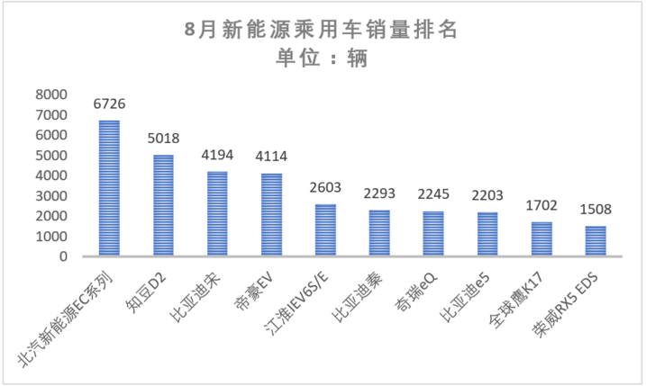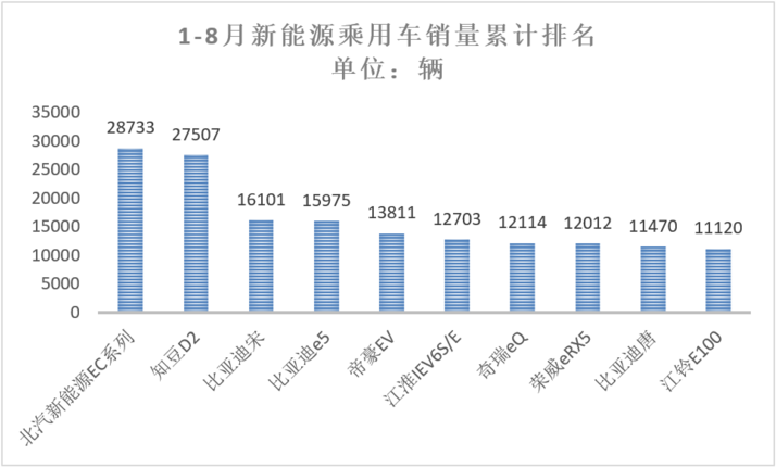 车型方面,8月销量前三名分别是北汽新能源EC系列、知豆D2、比亚迪宋。
