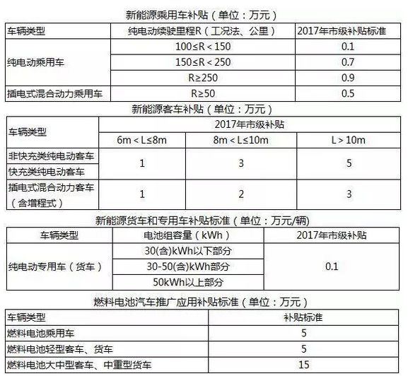 新能源乘用车和专用车地方补助标准按照财政部、科技部、工业和信息化部、发展改革委《关于调整新能源汽车推广应用财政补贴政策的通知》(财建〔2016〕958号)中,国家补助标准的50%执行;新能源客车地方补助标准按照上述国家补助标准的25%执行。燃料电池汽车按照国补50%进行,对每款新能源汽车,国家和地方补助总额不得高于车辆指导价格的50%。