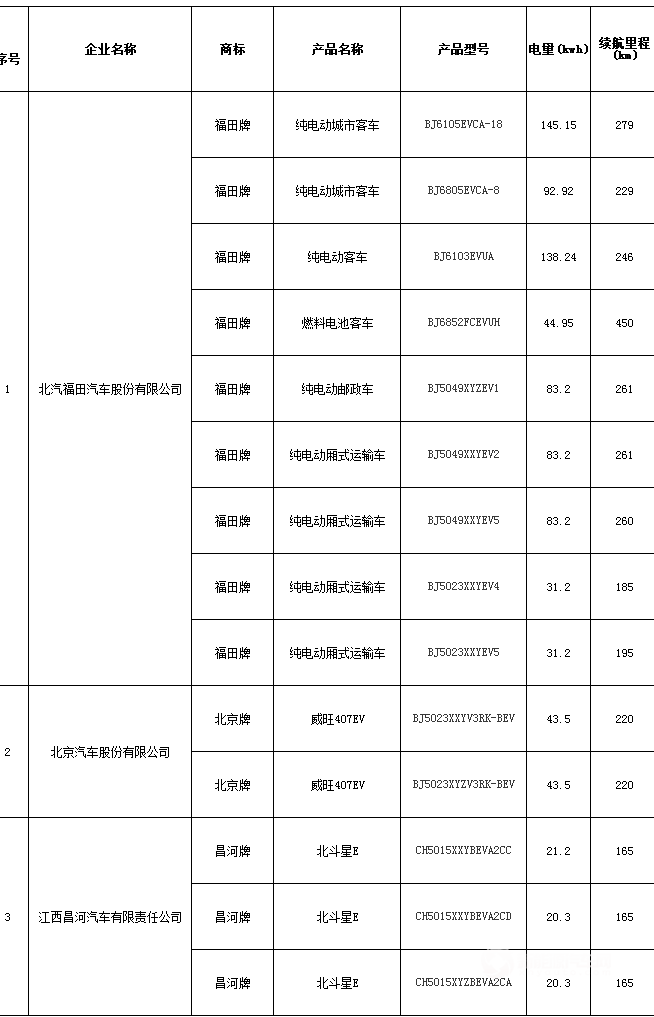 2017年10月13日,北京发布2017年第2批北京市推广应用新能源商用车生产企业及产品备案信息,此批产品目录包括14款车型,其中含9款福田汽车、2款北汽威望车、3款江西昌河牌车。详细如下: