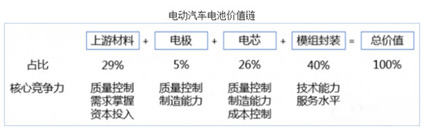 在锂电池产业链当中,电芯的制造与电池模组的封装是两个核心的环节。根据测算,在新能源汽车锂动力电池的成本构成中电极与电芯的制造占据了总成本的31%,模组封装则占据总成本的40%。