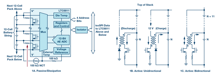 如图1a所示,被动均衡既简单又便宜。然而,被动均衡也非常缓慢,会在电池包内部产生有害的热量,均衡结果是将所有电池单元的剩余容量减少到与电池包中SoC最低的电池单元一致。此外,被动均衡缺乏能力有效解决另一种常见现象——容量不匹配引起的SoC误差。所有电池单元在老化时都会损失容量,损失速率往往不同,原因类似于串联电池单元的充电状态随着时间推移而出现差异。电池包电流均等地流入和流出所有串联电池单元,因此电池包的可用容量取决于电池包中容量最低的电池单元。只有图1b和图1c所示的主动均衡方法可以让电荷在整个电池包中重新分配,补偿电池单元间不匹配所造成的容量损失。