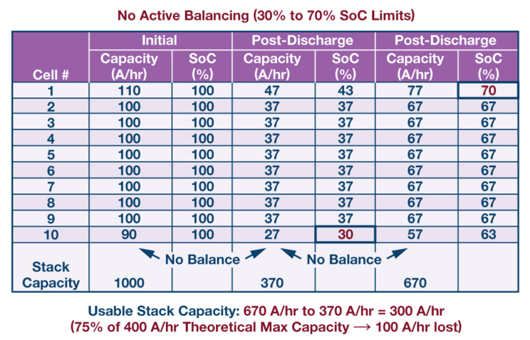 图2. 电池单元间不匹配导致电池包容量损失的例子。