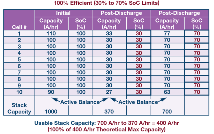 图3显示了使用理想主动均衡功能可以100%恢复因电池单元间不匹配而导致的容量损失。在稳态使用期间,当电池包从70% SoC 的完全充电状态放电时,必须从第1个单元(最高容量电池单元)中取出存储的电荷并转移到第10个单元(最低容量电池单元),否则第10个单元会先于其他单元达到最小30%的SoC点,导致电池包必须停止放电以防寿命进一步缩短。类似地,在充电阶段必须将电荷从第10个单元中移除,重新分配到第1个单元,否则第10个单元会率先达到70%的SoC上限,导致充电周期必须停止。在电池包使用寿命中的某个时间点,电池单元老化的差异将不可避免地造成电池单元之间的容量不匹配。只有主动均衡解决方案才能恢复容量,根据需要将电荷从高SoC单元重新分配给低SoC单元。为在电池包使用寿命期间实现最大容量,需要通过主动均衡解决方案来给单个电池单元有效充电和放电,以使整个电池包维持SoC均衡。
