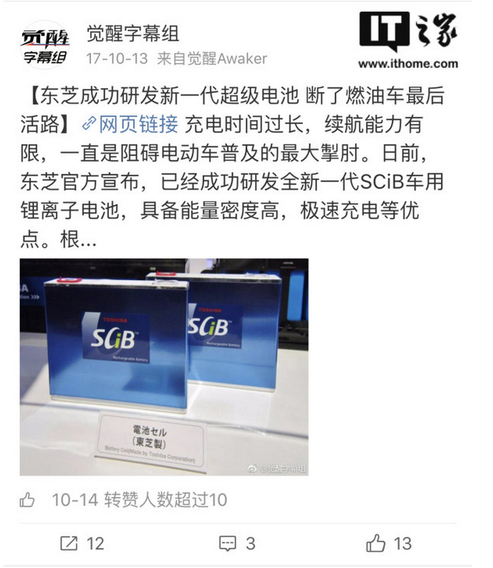 日前据外媒报道,东芝官方宣布已经成功研发新一代车用锂离子电池(简称:SCiB),这款电池被东芝称为“超级快充电池”,实测数据显示这种新型锂离子电池可达到充电6分钟,行驶320公里。