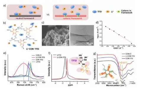 为促进COF内离子对的解离与离子迁移,研究人员提出在COF骨架中引入含离子基团的策略(图1)。不同于传统中性有机框架的思路,研究人员在含胍基阳离子的有机框架结构中引入TFSI阴离子,同时添加锂盐LiTFSI以提供传导所需的锂离子,获得了具有较高锂离子电导率的固态材料。这类有机框架上存在的离子基团与相应的反离子有效地提升了材料的介电常数与可极化率,从而改变锂盐的离子缔合状态,促进自由可迁移锂离子的形成。拉曼和其他光谱证明COFs中的TFSI-离子不再处于紧密络合状态。固体核磁7Li谱进一步表明所体系内存在相对更“自由”的Li+离子。电化学测量表明该材料的离子电导率可达2.09×10-4S cm-1 (70 ℃)。考虑到COF材料可设计的丰富结构,此类固态电解质的离子电导率和电化学稳定性有望可以被进一步优化;此类材料也有望适用于其他金属离子如Na+,K+,Mg2+,Al3+等的传导。此工作开拓了COF在固态电解质领域的应用,对COF材料设计和固态离子传导研究具有重要参考意义。