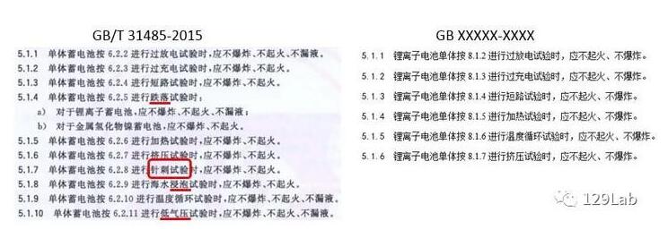 首先看一下GB单体电池的要求,过放、过充、短路、加热、温度循环、挤压,一共五项安全测试,跟GB/T31485-2015的10项测试要求相比,减少了4项。其中,单体电池的针刺要求也在GB里面取消了。
