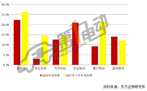 而从整个产业链角度看,一方面上游资源涨价阶段,议价能力极强,且盈利情况非常好;同时下游电芯企业竞争激烈,降价压力巨大;因此中游正极厂商将面临成本上升、销售价格承压的双重压力,整体盈利困难,东风证券研究所的研究结果显示,2017 年各正极公司毛利率水平均处于较低水平。业内平均毛利率为10~20%左右。拥有上游资源优势的公司如格林美的毛利率可达20%以上。