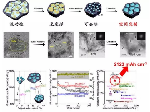 杨全红教授研究团队联合清华大学、国家纳米中心和日本国立材料研究所的合作者在高体积能量密度锂离子电池负极材料设计方面取得突破,基于石墨烯界面组装,发明了对致密多孔碳笼精确定制的硫模板技术。他们在采用毛细蒸发技术构建致密石墨烯网络的过程中,引入硫作为一种可流动的体积模板,为非碳活性颗粒完成了石墨烯碳外衣的定制。通过调制硫模板使用量,可以精确调控三维石墨烯碳笼结构,实现对非碳活性颗粒大小“合身”的包覆,从而在有效缓冲非碳活性颗粒嵌锂巨大体积膨胀的基础上,作为锂离子电池负极表现出优异的体积性能。