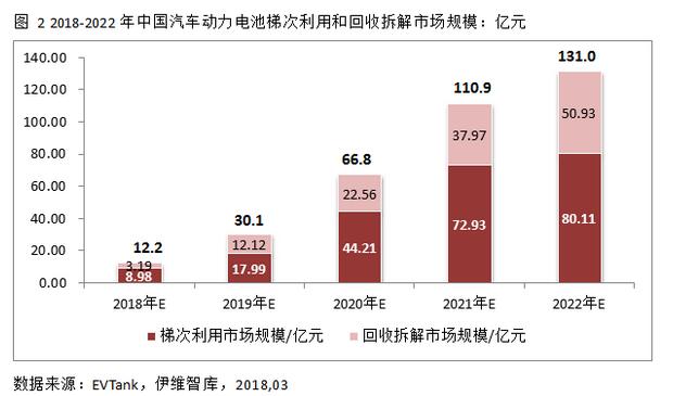 从市场规模来看,EVTank通过经济模型测算认为,到2020年中国动力电池回收拆解和梯次利用的总体市场规模将达到66.8亿元,到2022年整体市场规模将达到131.0亿元。通过对梯次利用和回收拆解的市场规模对比分析认为,EVTank认为梯次利用的市场规模远大于拆解利用。