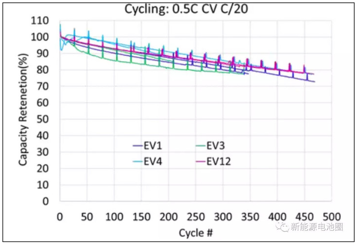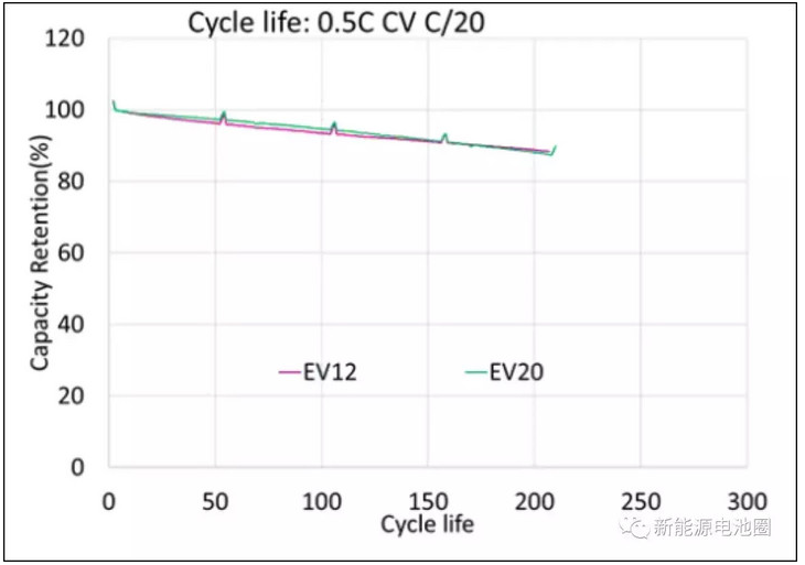 Farasis正在对3 Ah 18650电池以及单层软包电池进行电解液研究,评估和优化。下图显示了不同电解质配方的循环寿命结果,这是在没有预锂化的10-30 Ah电池中,匹配300 Wh/kg材料体系。结果表明,与其他电解质相比,EV12的循环寿命更好(450周循环@ 80%保持)。 含有EV12的电池还表现出较低的阻抗和较好的倍率性能。