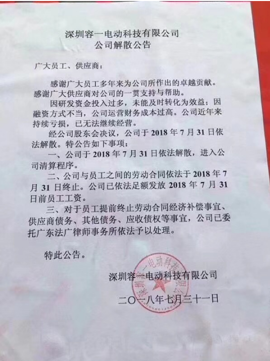 根据容一电动公告称,因公司研发资金投入过多,未能及时转化为效益,以及融资方式的不对,运营财务成本过高,导致近年来持续亏损,已经无法继续经营。根据公司股东会议决定,公司于2018年7月31日依法解散!