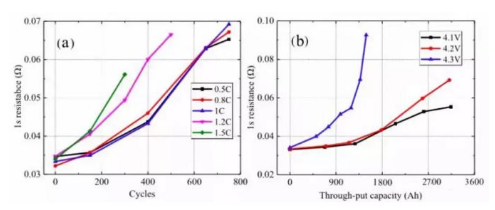 对电池的动态内阻分析如图所示,从图a测试结果来看,当充电电流小于1C时,电池动态内阻随着电池循环的变化趋势几乎时一样的,但是当充电电流超过1C时,电池动态内阻增加速度会随着充电速率的增加而快速增加。从图b的测试结果来看,当充电截止电压为4.3V时,电池动态内阻增加非常迅速表明高截止电压会恶化电池的动力学条件,截止电压为4.1V和4.2V时电池动态内阻增加较为缓慢。