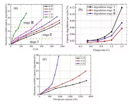 从数据可以看到,随着充电的倍率的加大,锂离子电池的衰降速率也在快速增加,并且从曲线的斜率来看,电池的衰降速度存在三个不同的阶段,前期衰降速度较快的阶段(阶段1),中间衰降速度较慢的稳定阶段(阶段2),和后期的衰降速率加速阶段(阶段3)。针对三个阶段电池的衰降机理的研究认为,阶段1可能是因为电池SEI膜生长需要消耗一部分Li+,因此衰降速度较快。在阶段2随着SEI膜结构的稳定,内部较为稳定,因此衰降速度较慢,在阶段3随着电池老化,开始发生活性物质损失,电极活性界面减少,导致电池对于电流十分敏感。图C是针对不同的截止电压对电池衰降速度影响的实验,从实验结果可以看到,当把充电截止电压提高到4.3V时会导致电池的循环性能急剧恶化,降低充电截止电压可以有效的改善电池的循环性能。