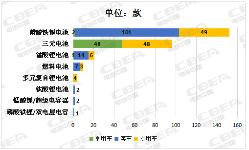从电池类型来看,在288款新能源车型中,磷酸铁锂电池配套152款、三元电池配套96款、锰酸锂电池配套21款、燃料电池配套10款、多元复合锂电池配套4款、钛酸锂电池配套2款、锰酸锂/超级电容器配套2款、磷酸铁锂/双电层电容配套1款。