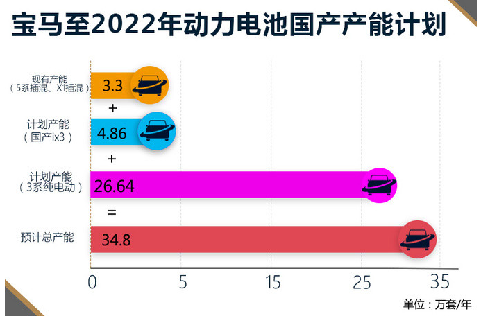 目前宝马在售的国产新能源车型包括5系插混、X1插混两款产品,年规划产能达到3.3万辆。今年4月份宝马发布了i系列首款SUV车型——iX3,新车也是i系列首款基于现有畅销车型打造的产品,规划产能达到4.86万辆/年。此次的纯电动3系将于2022年正式投产,配套动力电池产能更是达到26.64万套/年,这也意味着新车年规划产能也将达到26.64万辆。2022年全部新能源项目达产后,华晨宝马在新能源领域的总产能将达到34.8万套/辆。