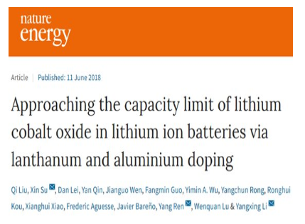 第二项成果:Approaching the capacity limit of lithium cobalt oxide in lithium ion batteries via lanthanum and aluminium doping(通过掺杂镧和铝,使锂离子电池中的钴酸锂接近理论容量)。该成果是华为中央研究院联合美国阿贡国家实验室通过掺杂La和Al,将LiCoO2的稳定电压提高到了4.5V,可逆容量达到190mAh/g。