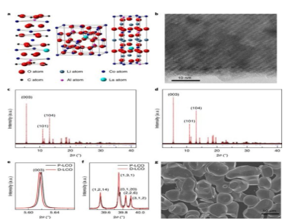 为此,华为中央研究院联合美国阿贡国家实验室通过La和Al掺杂,将LiCoO2的稳定电压提高到了4.5V,可逆容量达到190mAh/g,其中La能够增加LCO材料在c轴方向上的晶胞参数,Al则能够起到促进Li+扩散、稳定晶体结构和防止LCO材料相变的作用,两者相互作用显著改善了LCO材料在高电压下的结构稳定性,循环50次后仍然能够保持96%的容量,并使得LCO材料的倍率性能得到了大幅提高。