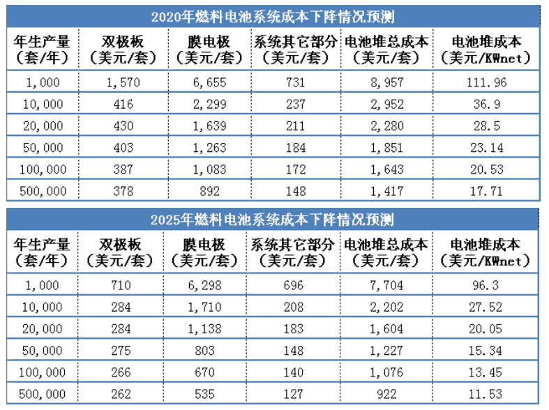 影响其成本的主要组件包括燃料电池堆中的质子交换膜、催化剂中铂的含量、双极板材料,以及电池系统中的储氢罐、升压变频器、动力单元等。