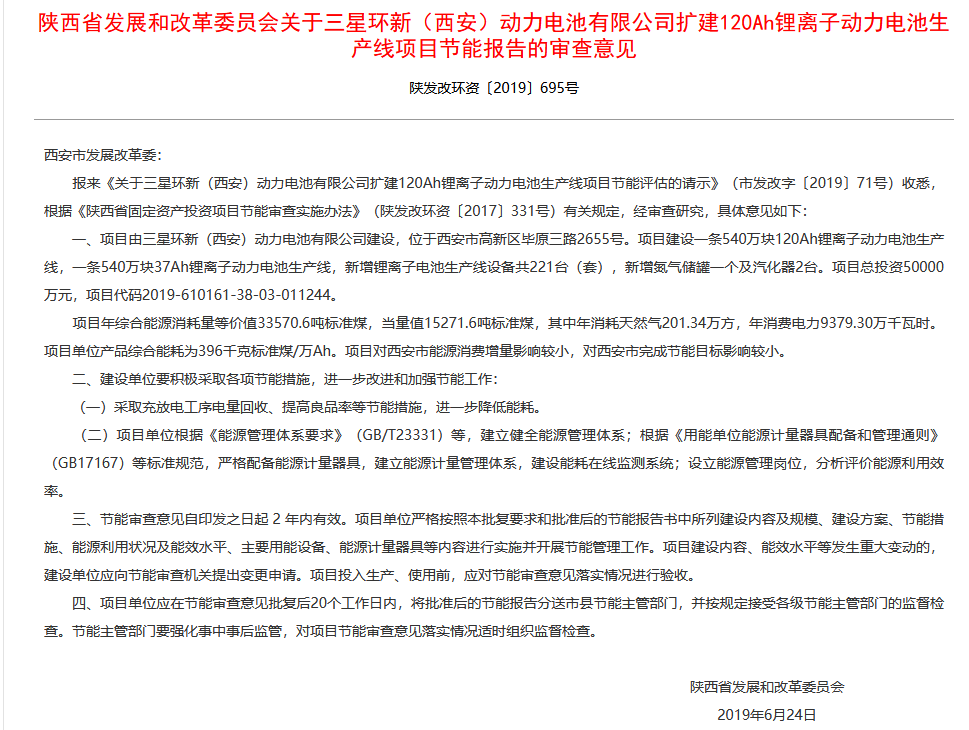值得关注的还有另一则消息,2019年6月24日,陕西省发展和改革委员会官网发布了一则“关于三星环新(西安)动力电池有限公司扩建120Ah锂离子动力电池生产线项目节能报告的审查意见”的信息。信息显示,该项目由三星环新建设,将建设一条540万块120Ah锂离子动力电池生产线(约2.4GWH),一条540万块37Ah锂离子动力电池生产线(约0.8GWH),新增锂离子电池生产线设备共221台(套),新增氮气储罐一个及汽化器2台,该项目总投资5亿元。这表明三星SDI在华动力业务布局加快,并且正在大幅扩充产能。