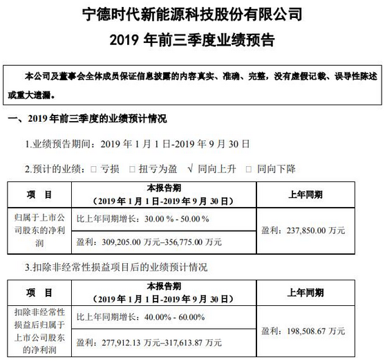 宁德时代10月14日晚间发布的2019年前三季度业绩预告显示,前三季度公司归属于上市公司股东的净利润为30.92亿-35.68亿元,较上年同期增长30%-50%。扣除非经常性损益后归属上市公司股东的净利润为27.8亿-31.76亿元,同比增长40%-60%。