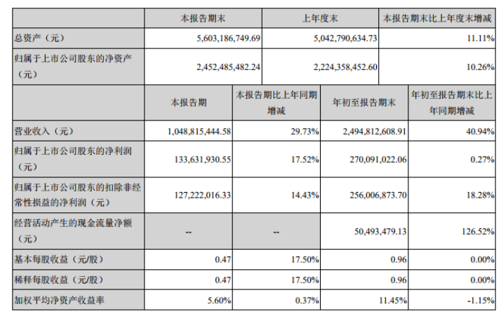 鹏辉能源(300438)发布2019年第三季度报告,公司第三季度实现营业收入10.49亿元,同比增长29.73%;归属于上市公司股东的净利润1.34亿元,同比增长17.52%;归属于上市公司股东的扣除非经常性损益的净利润1.27亿元,同比增长14.43%;基本每股收益0.47元。前三季度,公司实现营业收入24.95亿元,同比增长40.94%;归属于上市公司股东的净利润2.7亿元,同比增长0.27%;归属于上市公司股东的扣除非经常性损益的净利润2.56亿元,同比增长18.28%;基本每股收益0.96元。